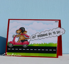 Goodmorning, today I am posting a new card for Gerda Steiner designs. This time I made a card with the digital stamp Dog on scooter - Vrooming by from Gerda Steiner designs. I have coloured the image with my Polychromos pencils and then I have fussy cut the image. With the Crea-nest-lies XXL 52 from Crealies I have die-cut a rectangle from white cardstock. I added a cloudy background on it with Tumbled glass distress ink and the Mini cloud edges stencil from My favorite things. From black cardstock I have die-cut a road with the Open road die-namics from My favorite things. I used the Grassy hills die-namics from My favorite things to die-cut some grass from white cardstock. I coloured the grass with Twisted citron and Mowed lawn distress ink. After I adhered the grass and the road on the rectangle, I adhered the image with foamtape on the card. I printed the sentimen on white cardstock and then I made a sort of cloud around it with a black pen. I have fussy cut the sentiment and adhered it on the card. I decorated the card with black hotfix gems.