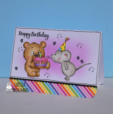 Ik heb deze keer 2 digitale stempels met elkaar gecombineerd, omdat ze erg goed bij elkaar passen. De eerste afbeelding is de Birthday bear van Gerda Steiner designs. De Make a wish mouse blowing out birthday cake candle van Gerda Steiner designs past daar erg goed bij. Ik heb het kleine taartje van deze afbeelding gewoon niet gebruikt. Ik heb beide afbeeldingen ingekleurd met mijn Polychromos potloden, de zwarte glaze pen en een witte gelpen. Ik heb daarna beide afbeeldingen uitgeknipt. Op een stuk wit karton heb ik in de linker bovenhoek een tekst van de All cats Clear stamp set van Gerda Steiner designs gestempeld en daarna heb ik met Versafine clair glamorous inkt een achtergrond voor mijn afbeelding gemaakt. Ik heb de muis en beer daarna met foamtape op het witte karton geplakt. Op een witte kaart heb ik een strip streepjes design papier van het Over the rainbow paperpad van My favorite things geplakt. Ik heb een scallop randje gestanst uit zwart karton met de Crea-nest-lies XXL 56 van Crealies en deze heb ik onder het witte karton geplakt en daarna heb ik dit met foamtape op de kaart geplakt. Met een zwarte fineliner heb ik een kadertje op het witte karton getekend. Daarna heb ik nog met een sterretjes en vlekjes stempel van de set Rocking the wreath van Alpaca pals gestempeld rondom de afbeeldingen.