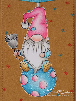 Goodmorning, today the last challenge for this year has started on the Di's digi designs challenge blog. We want to see a Christmas or winter card for this challenge. I have made a christmas card with the digital stamp Jingle bell gnome from Di's digi stamps. I have coloured the image with my Polychromos pencils and the Clear Spectrum noir sparkle glitter pen and then I have fussy cut the image.