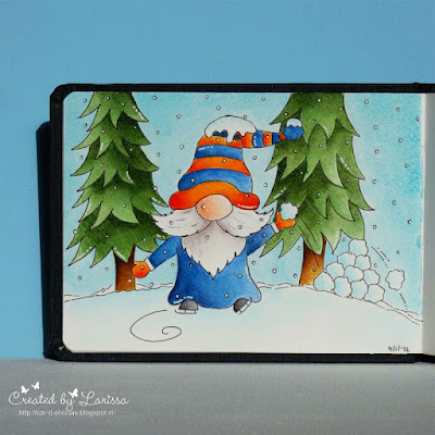 Hello, yesterday evening I have followed a live tutorial on instagram from Charlotte van de Haar. This time we were going to draw Wintergnomes. We made 2 different gnomes. I have drawn them on 2 separate pages in my book and decided to make 2 different scenes. I have finished my first drawing yesterday en tonight I will be colouring my second drawing. I have drawn the images in a A6 Landscape watercolour book from Hahnemühle. I had seen this book a few times and when the shop Hobbycompleet de Duif had a nice discount just before the new year I decided to buy one. I really loved working in it and although I used a lot of water the page is still straight. I started my drawing with a pencil, then I used a water proof fineliner and then I coloured the scene with the bottles Distress ink. The snow and little details are made with a white gelpen. I really enjoyed this live tutorial and I am looking forward to colour my next scene tonight!