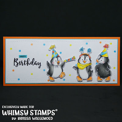 I have printed the image Penguins party (digital stamp) from Whimsy stamps and then I coloured the image with my Polychromos pencils, the black glaze pen and a white gelpen. I have fussy cut the images. With the Slimline card builder die set from Whimsy stamps I have cut a rectangle from white cardstock. I have glued it on blue cardstock and then I glued the rectangles on an orange slimline card. I have stamped a sentiment from the set Everyday scripted sentiments (CWSD155) from Whimsy stamps on the white rectangle. With Versafine Golden meadow, Summertime and Warm breeze ink I have stamped a little star from the set AiFROGabet (clear stamps) from Whimsy stamps on the rectangle to create a background. I have glued the images with foamtape on the card.