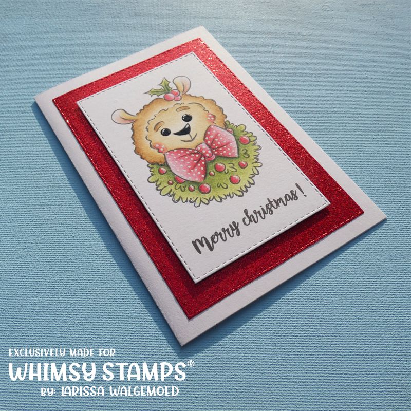 Hello, today I am posting a new christmas card that I have made with an image from Whimsy stamps. I have printed one of the images from the Fa La La Llama (digital stamp set) from Whimsy stamps on white cardstock and added a sentiment under the image. I have coloured the image with my Polychromos pencils, the black glaze pen and a white gelpen. I have die-cut the image with the Crea-nest-lies XXL 36 from Crealies and used a larger die from the same set to cut a rectangle from red glitter cardstock. I have glued the red rectangle on a white card and then I added the image with foamtape.