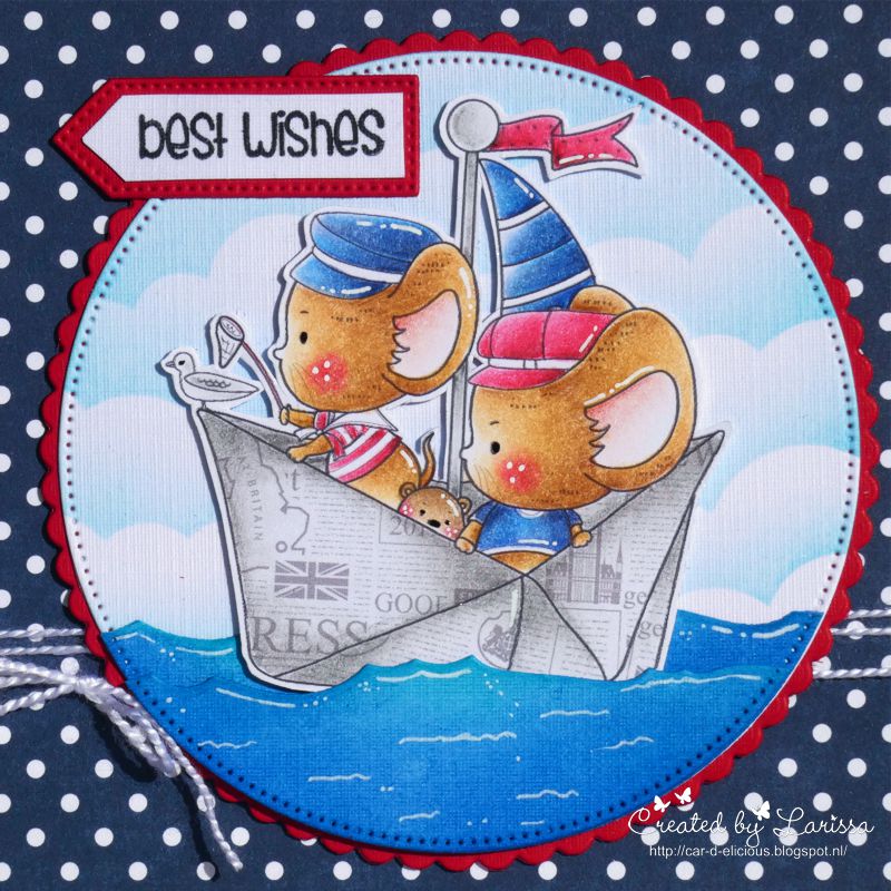 Hello, today a new challenge starts on the Di's digi designs challenge blog and this time we would love to see cards that are related to sports. I decided to go for sailing and used the digital stamp Dream boat mice from Di's digi stamps. I have coloured the image with my Polychromos pencils, the black glaze pen and a white gelpen and then I have fussy cut the image. With the Crea-nest-lies XXL 49 from Crealies I have cut 2 circles from white cardstock. On the first circle I made a background with the Mini cloud edges stencil (retired) from My favorite things and Peacock feathers Distress ink. The second circle was used to create the waves with the Ocean view dies (LR0664) from Marianne design. I have coloured the waves with Peacock feathers and Prize ribbon Distress ink and then I doodled on them with a white gelpen. I have glued the image with foamtape on the background. I have cut a scalloped circle from red cardstock with the Crea-nest-lies XXL 53 from Crealies and glued the image with the circle on top With the Crea-nest-lies XXL 27 (retired) from Crealies I have cut a square from blue and white dotted paper (I don't know the brand) and I glued it on a red card after I tied white embroidery thread around it. I have stamped a sentiment from the set So much to say (retired) from Clearly besotted on white cardstock and then I have die cut the sentiment and a bigger banner from red cardstock with the Stitched straight tag from Nellie Snellen. I glued the banner with foamtape on the card.
