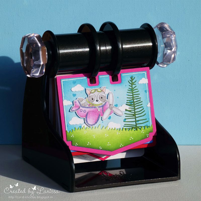 Hello, I decided to make a card for my Memory dex again after a long while and I made one with an image from Di's digi stamps. I printed the image Aeroplane racoon from Di's digi stamps and then I coloured the image with my Polychromos pencils and the Black glaze pen from Sakura and then I have fussy cut the image. I have made my memory dex card from pink and white cardstock with the set Cutting Die Rolodex - no.2 from Vaessen Creative. On the white cardstock I have made a background with Tumbled glass and Broken china Distress ink. I added a couple of hearts with the Lots of love stencil from Echo park and Broken china Distress ink. With a white gelpen I have drawn lines around the edges of the background. From white cardstock I have cut a couple of clouds with the Mini clouds (retired) from Memory box and then I glued those on the background. I cut another layer for my memory dex card and cut the top of it with the Grassy hills die-namics (retired) from My favorite things. I coloured the grass with Twisted citron, Mowed lawn and Rustic wilderness Distress ink and dots on the grass with a white gelpen. With the Thin pine tree (D220938) from Gummiapan I have cut a tree from white cardstock and coloured it with Mowed lawn and Rustic wilderness Distress ink. I glued the tree on the background and then the grass hill on top of that. I glued the image with foamtape on the card.